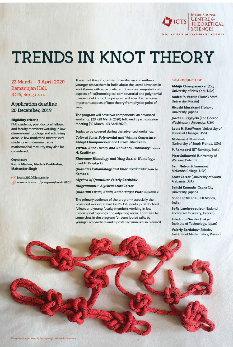 Knots are fundamental objects of study in low dimensional topology and appear in diverse areas of sciences. Knot theory has seen tremendous progress in the recent years. The aim of this online program is to familiarise and enthuse younger researchers about the latest advances in the subject with a particular emphasis on computational aspects of (co)homological, combinatorial and polynomial invariants of knots.