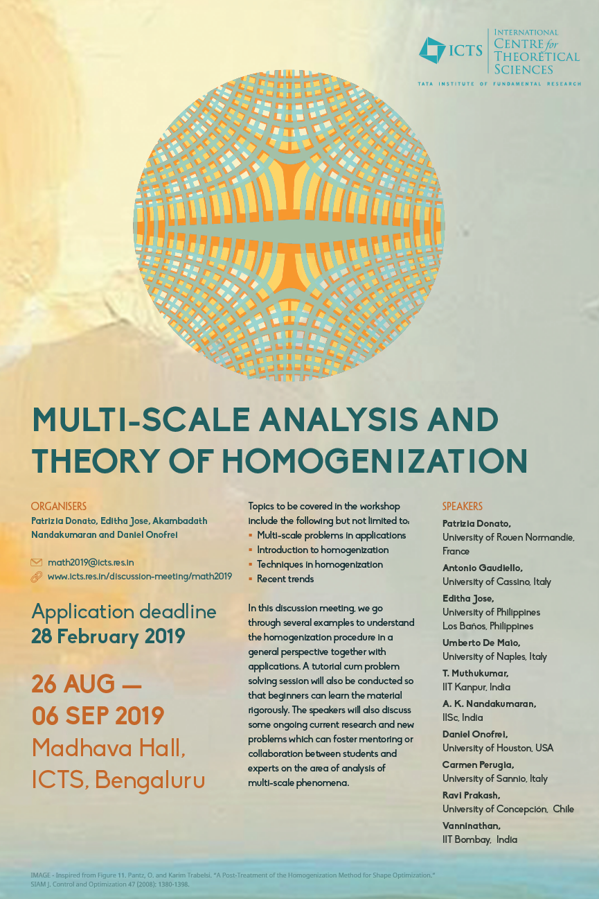 In addition to the basic material of homogenization, the speakers will be presenting the recent results in their area of expertise and this will be an opportunity for the youngsters to get into this beautiful area of research. Further, every day, we are planning to have a tutorial cum problem solving session through which the beginners can learn the material in a better way. To make the tutorials/training sessions more effective, we may form small groups and each group may be asked to do some specific material which they can present in the last day. Each small group may be trained by one of the speakers who are available for the entire workshop,