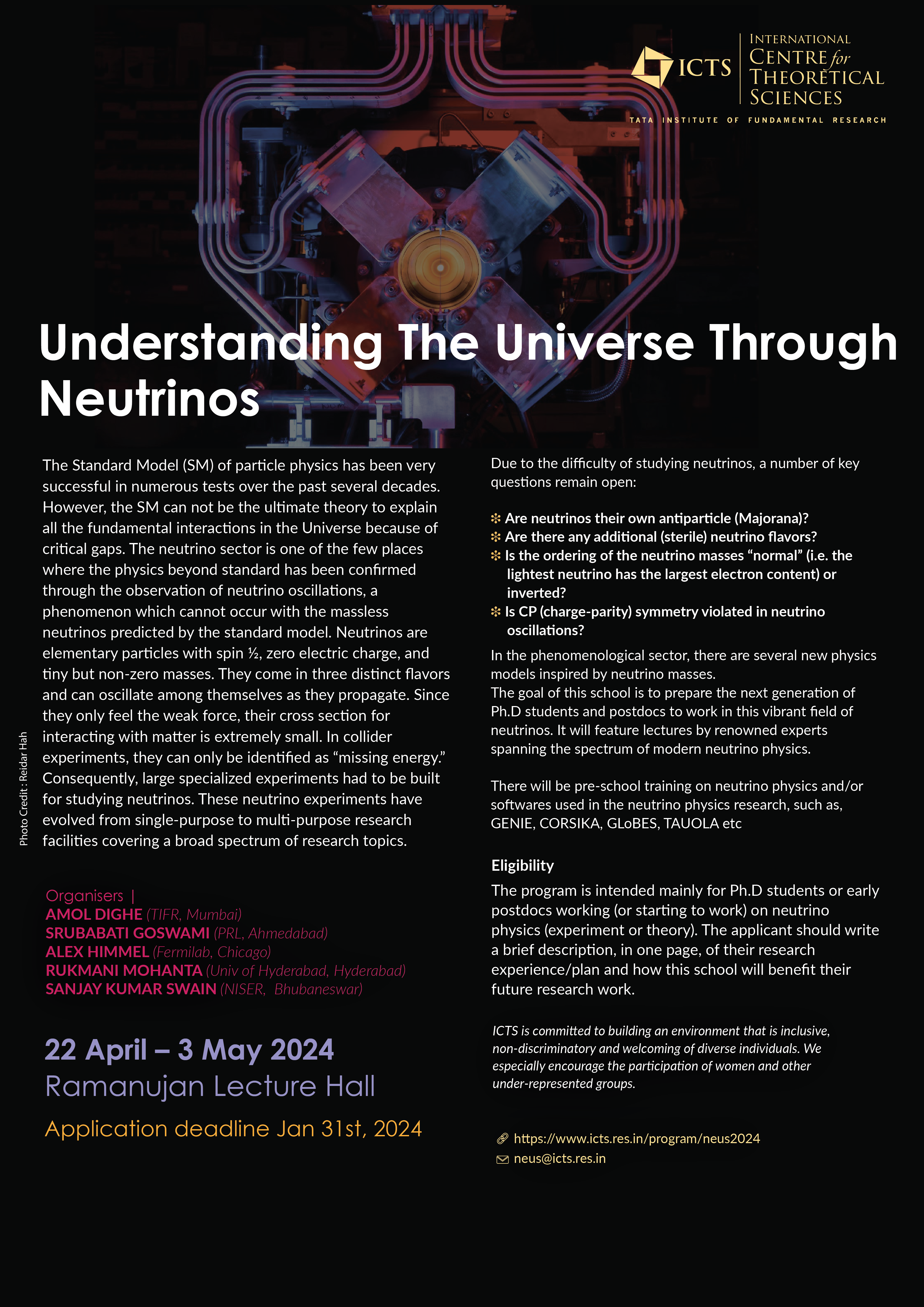 Eligibility Criteria: The program is intended mainly for PhD students or early postdocs working (or starting to work) on neutrino physics (experiment or theory). The applicant should write a brief description, in one page, of their research experience/plan and how this school will benefit their future research work.
