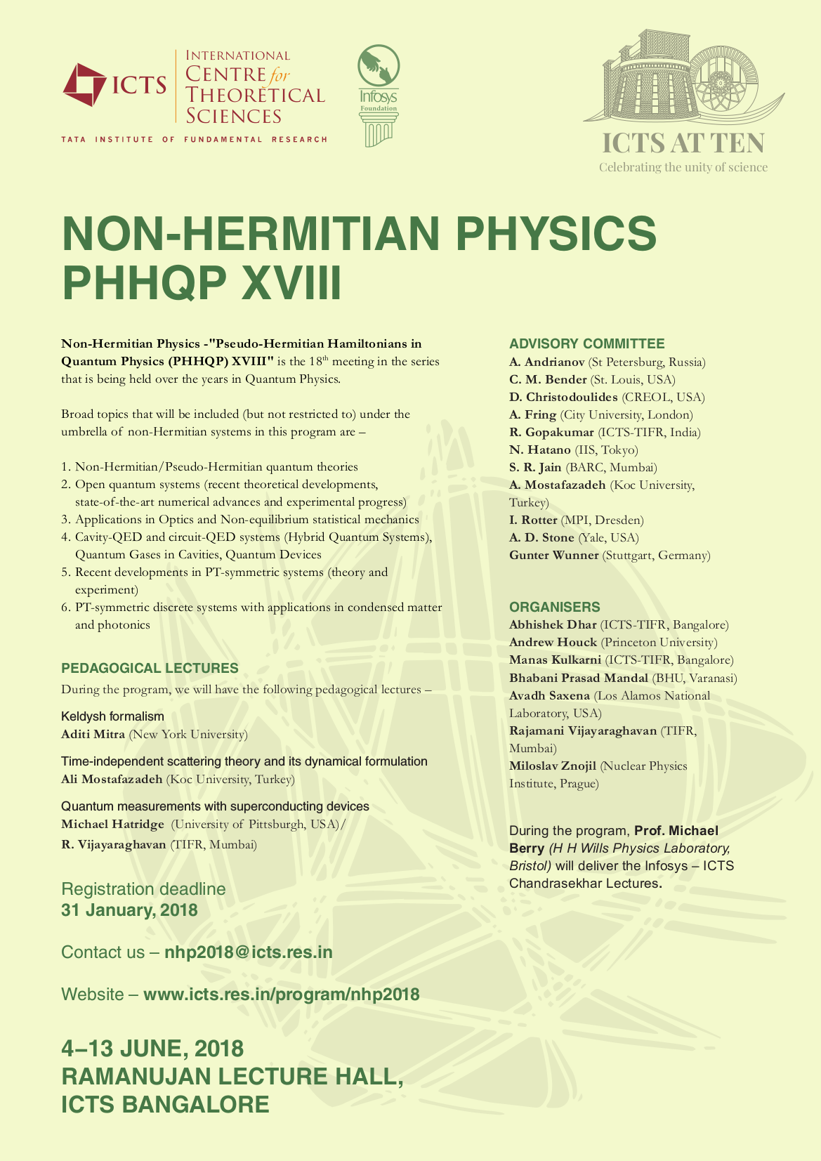 During the program, Prof. Michael Berry (H H Wills Physics Laboratory, Bristol, UK) will be delivering the Infosys - ICTS Chandrasekhar Lectures.