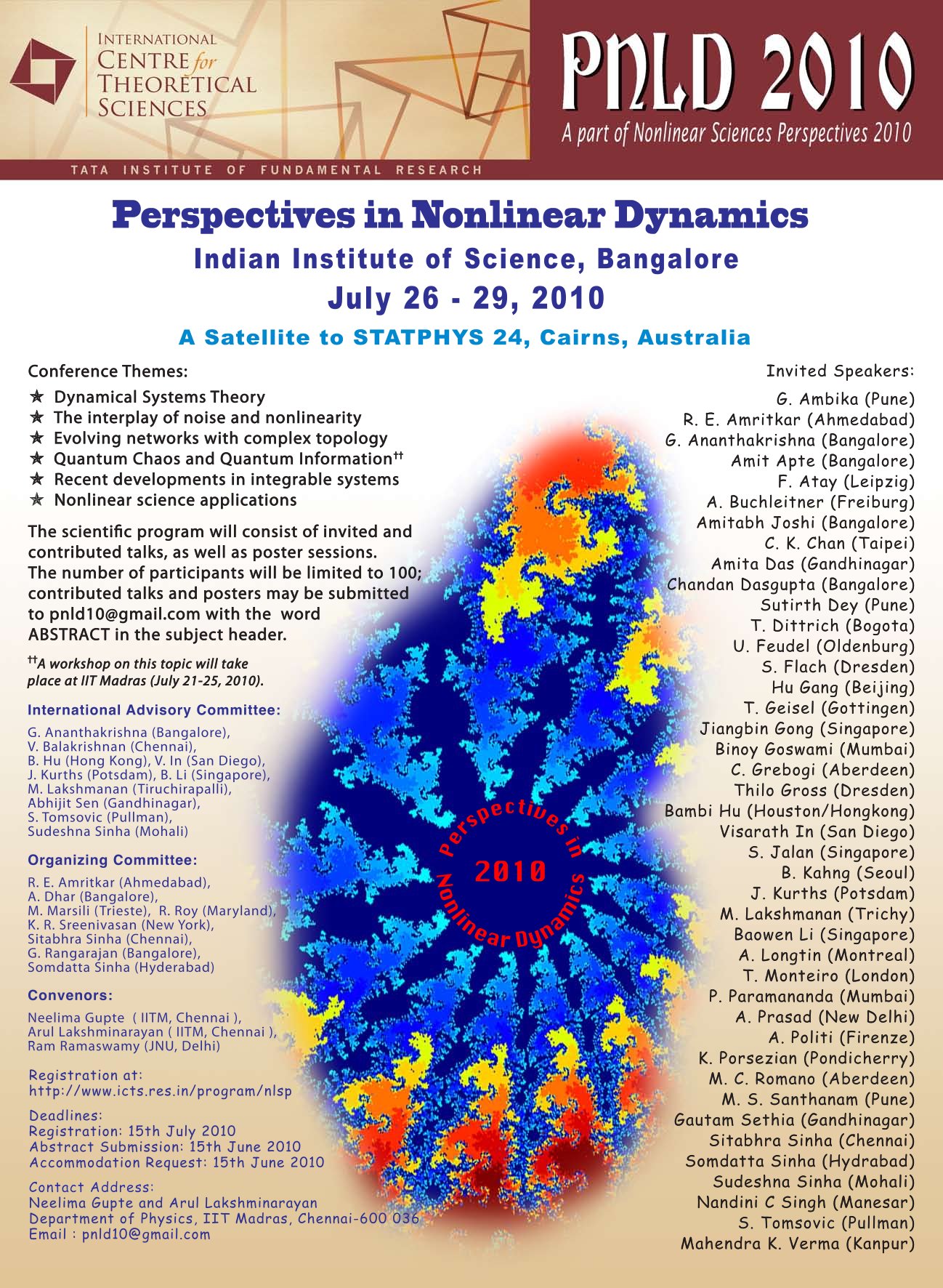 Conference: Perspectives in Nonlinear Dynamics PNLD 2010 from 26 July to 29 July at IISc,Bangalore.