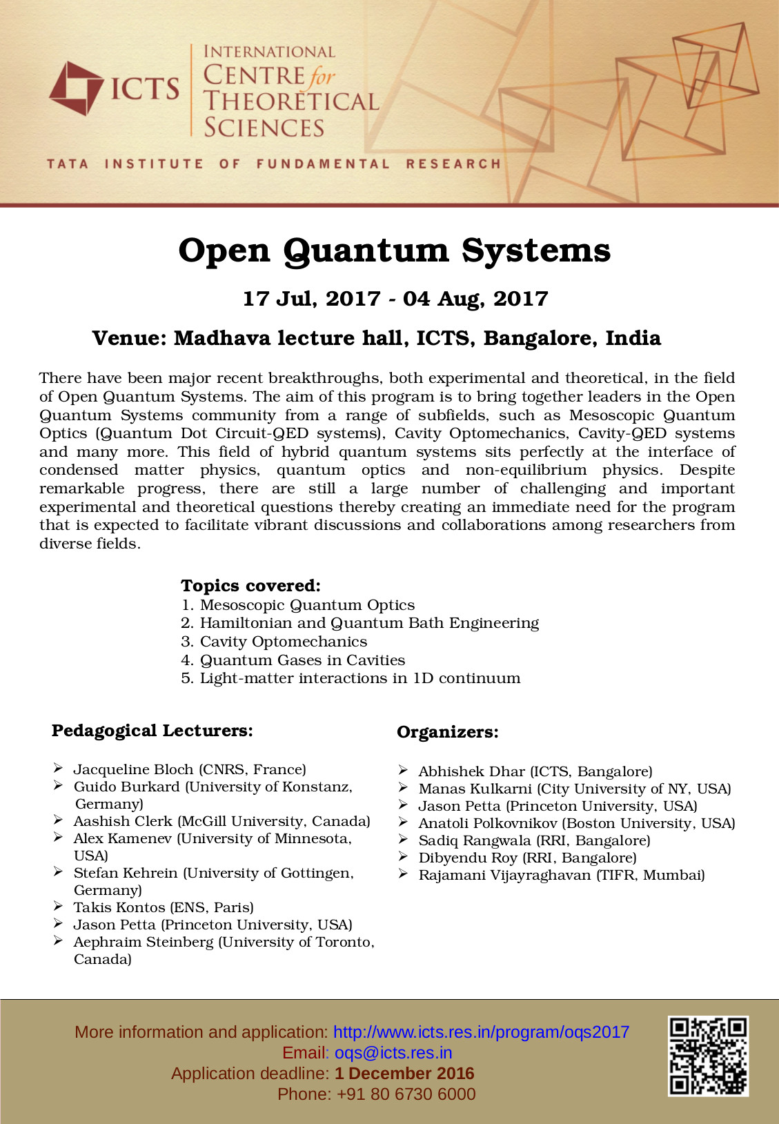 There have been major recent breakthroughs, both experimental and theoretical, in the field of Open Quantum Systems. The aim of this program is to bring together leaders in the Open Quantum Systems community from a range of subfields, such as Mesoscopic Quantum Optics (Quantum Dot Circuit-QED systems), Cavity Optomechanics, Cavity-QED systems and many more. This field of hybrid quantum systems sits perfectly at the interface of condensed matter physics, quantum optics and non-equilibrium physics. Despite remarkable progress, there are still a large number of challenging and important experimental and theoretical questions thereby creating an immediate need for the program that is expected to facilitate vibrant discussions and collaborations among researchers from diverse fields.