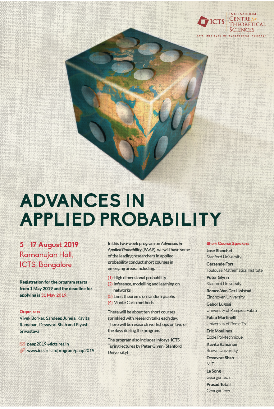 In this two-week program on advances in applied probability (PAAP), we will have some of the leading researchers in applied probability conduct short courses in emerging areas, including: