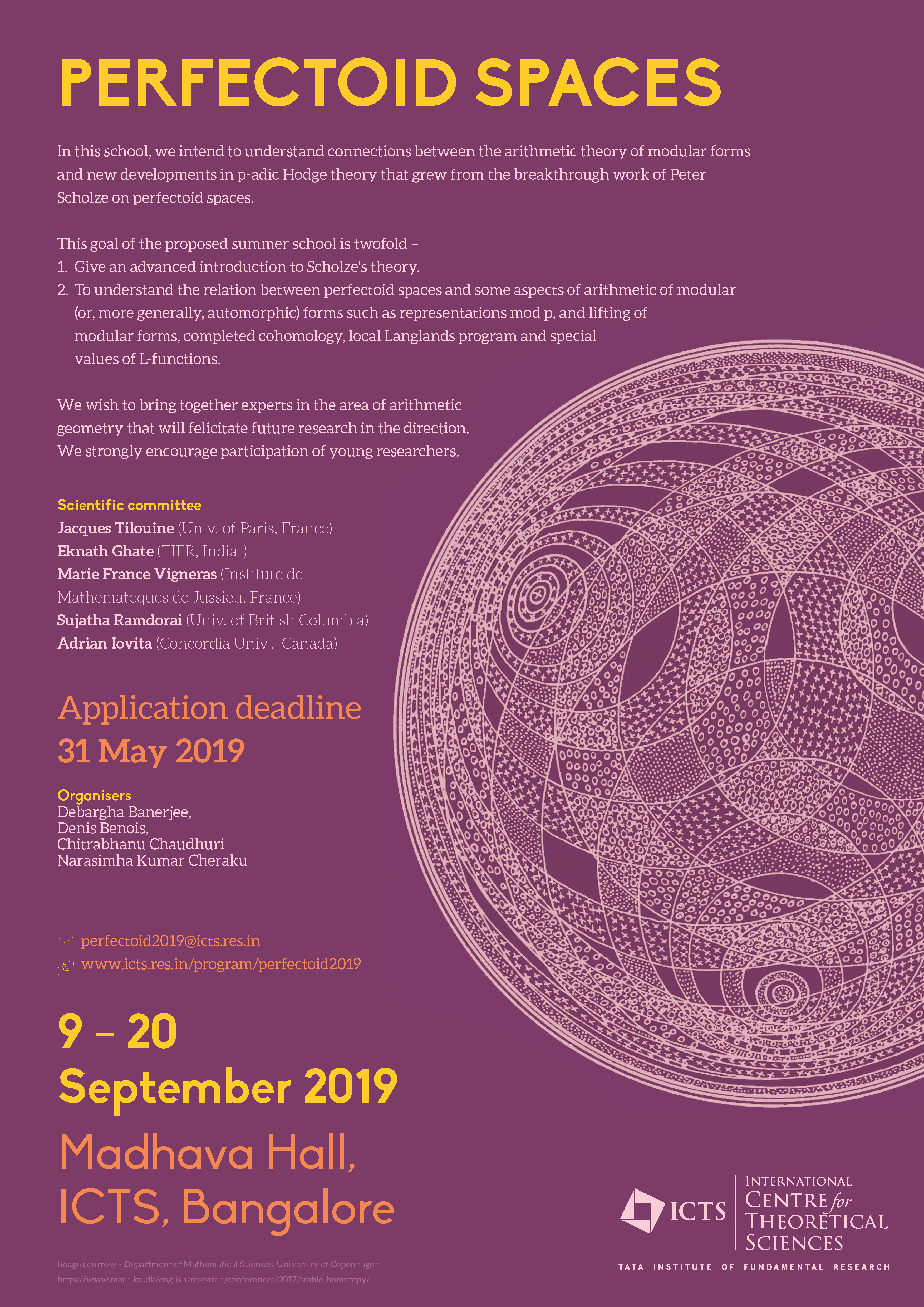 Workshop on "Perfectoid spaces" will be from 09 - 13th September, 2019 and the discussion meeting on "p-adic automorphic forms and perfectoid spaces" will be from 16-20th September, 2019.