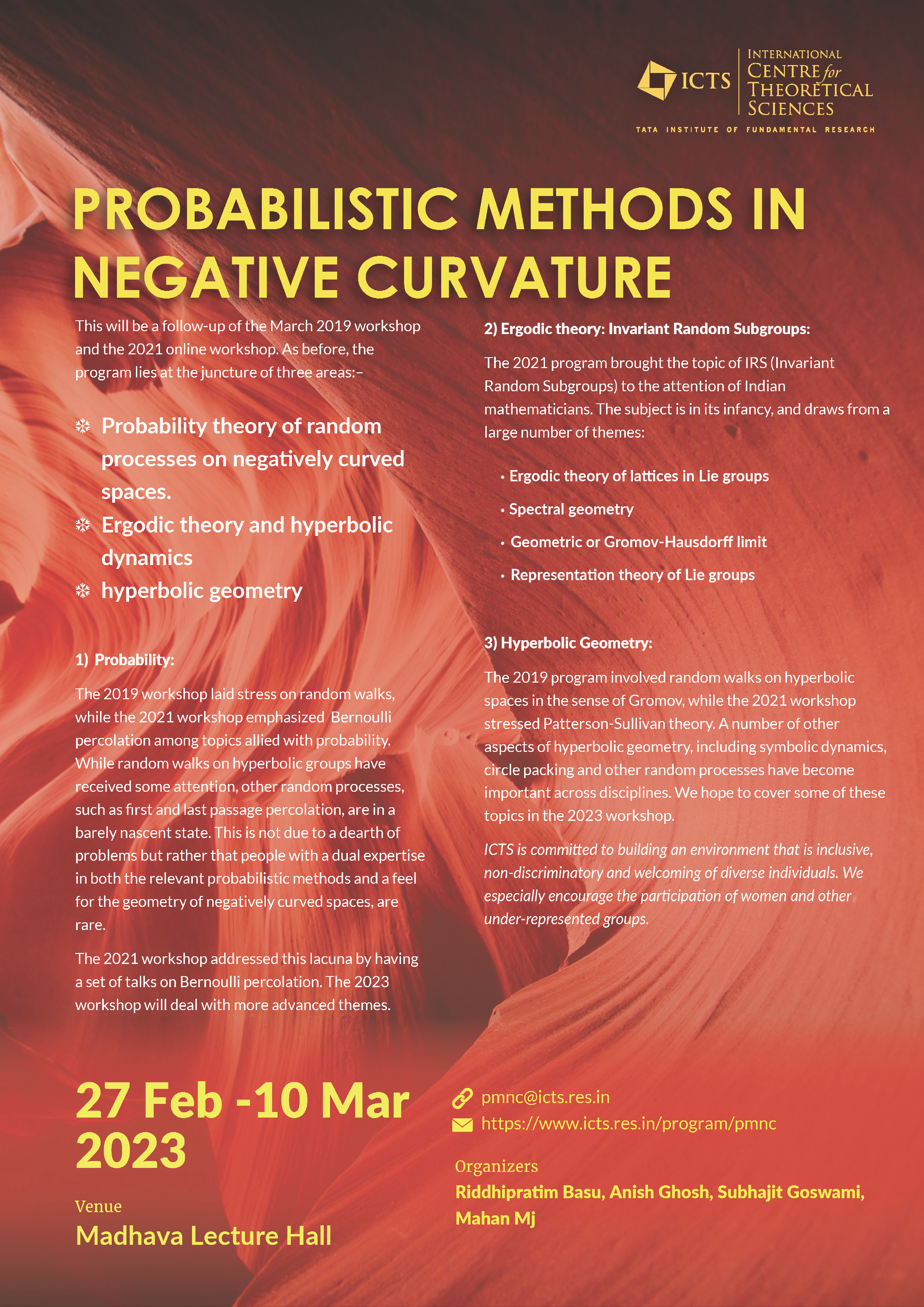 The 2019 program involved random walks on hyperbolic spaces in the sense of Gromov, while the 2021 workshop stressed Patterson-Sullivan theory. A number of other aspects of hyperbolic geometry, including symbolic dynamics, circle packing and other random processes have become important across disciplines. We hope to cover some of these topics in the 2023 workshop.