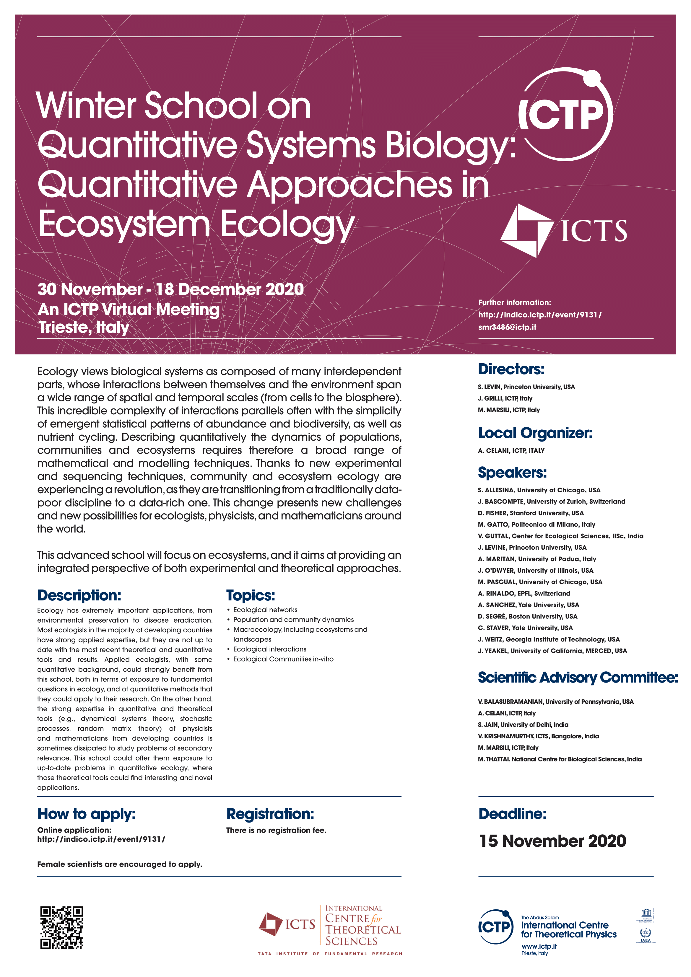 Ecology has extremely important applications, from environmental preservation to disease eradication. Most ecologists in the majority of developing countries have strong applied expertise, but they are not up to date with the most recent theoretical and quantitative tools and results. Applied ecologists, with some quantitative background, could strongly benefit from this school, both in terms of exposure to fundamental questions in ecology, and of quantitative methods that they could apply to their research. On the other hand, the strong expertise in quantitative and theoretical tools (e.g., dynamical systems theory, stochastic processes, random matrix theory) of physicists and mathematicians from developing countries is sometimes dissipated to study problems of secondary relevance. This school could offer them exposure to up-to-date problems in quantitative ecology, where those theoretical tools could find interesting and novel applications.