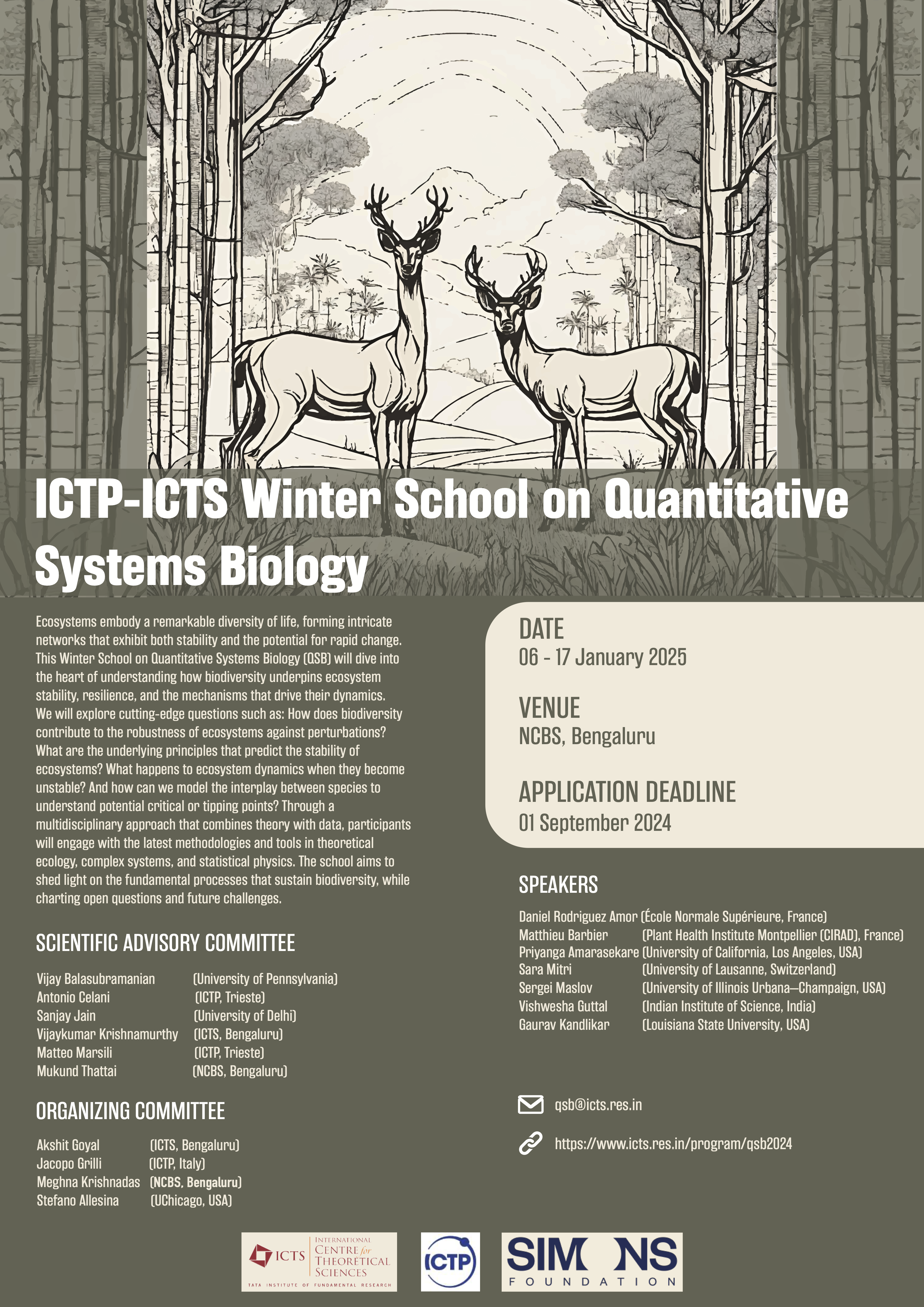 Ecosystems embody a remarkable diversity of life, forming intricate networks that exhibit both stability and the potential for rapid change. These systems, governed by complex interactions among organisms and their environment, present a rich tapestry for scientific exploration. This Winter School on Quantitative Systems Biology (QSB) will dive into the heart of understanding how biodiversity underpins ecosystem stability, resilience, and the mechanisms that drive their dynamics. We will explore cutting-edge questions such as: How does biodiversity contribute to the robustness of ecosystems against perturbations? What are the underlying principles that predict the stability of ecosystems? What happens to ecosystem dynamics when they become unstable? And how can we model the interplay between species to understand potential critical or tipping points? Through a multidisciplinary approach that combines theory with data, participants will engage with the latest methodologies and tools in theoretical ecology, complex systems, and statistical physics. The school aims to shed light on the fundamental processes that sustain biodiversity, while charting open questions and future challenges.