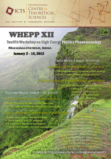 WHEPP-XII, which is also being organised as an ICTS programme, will be held at the densely wooded and pleasantly cool hill station at Mahabaleswar, about four hours drive from the international airport at Mumbai. The academic activity will take place over two weeks. The first week will be devoted to Cosmology, Astroparticle Physics and Nonperturbative Methods in Strong Interaction Physics, while the second part will be devoted to Model Building, Collider Phenomenology, Neutrino Physics and B-Physics. All participants will be provided free accommodation at the picturesque and comfortable Fountain Hotel in Mahabaleswar. Participation will be only by invitation. There will be no registration fee.