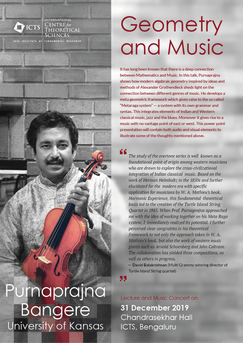 It has long been known that there is a deep connection between Mathematics and Music. In this talk, Purnaprajna shows how modern algebraic geometry inspired by ideas and methods of Alexander Grothendieck sheds light on the connection between different genres of music. He develops a meta geometric framework which gives raise to the so called “Metaraga system” — a system with its own grammar and syntax. This integrates elements of Indian and Western classical music, jazz and the blues. Moreover it gives rise to a music with no vantage point of east or west. This power point presentation will contain both audio and visual elements to illustrate some of the thoughts mentioned above.